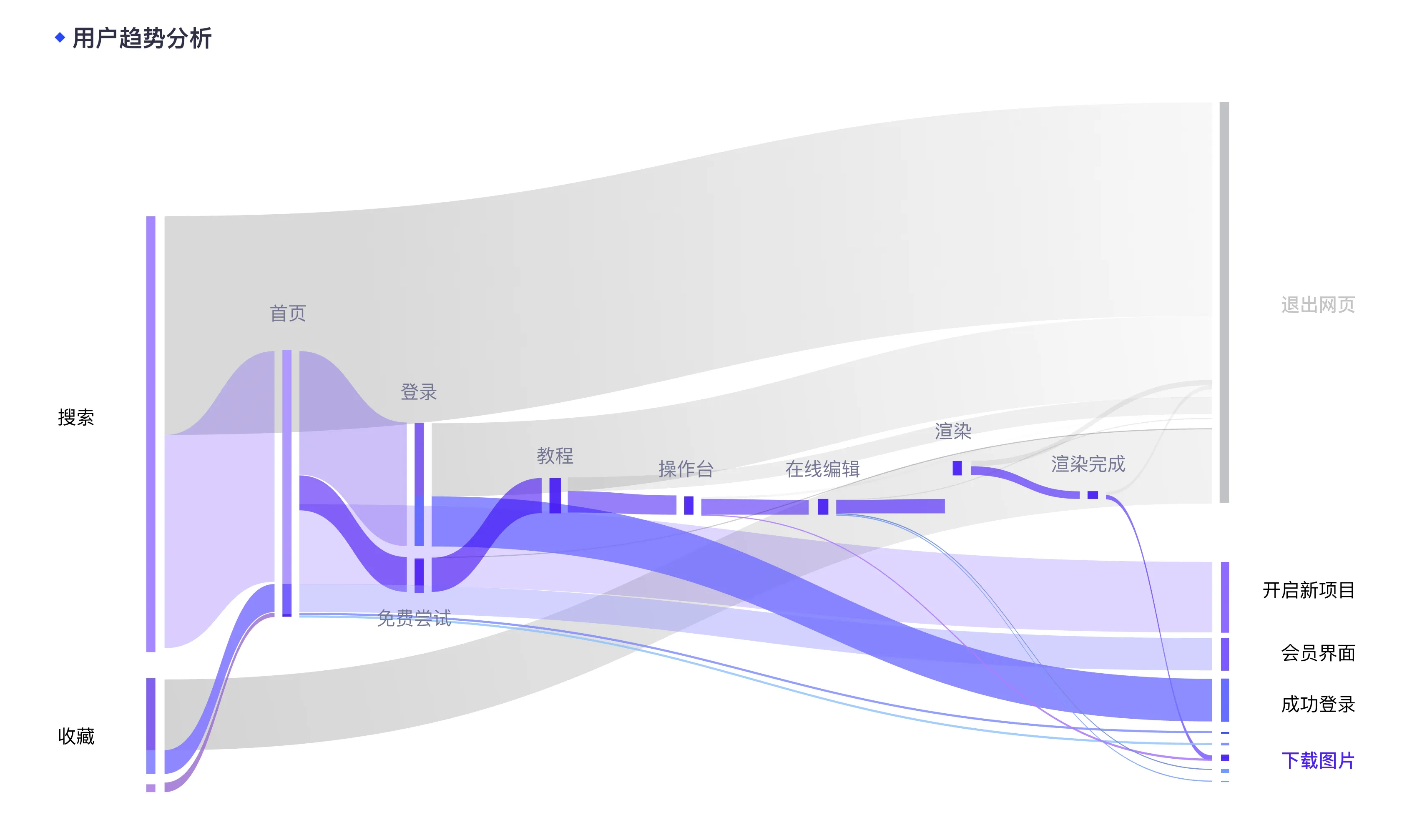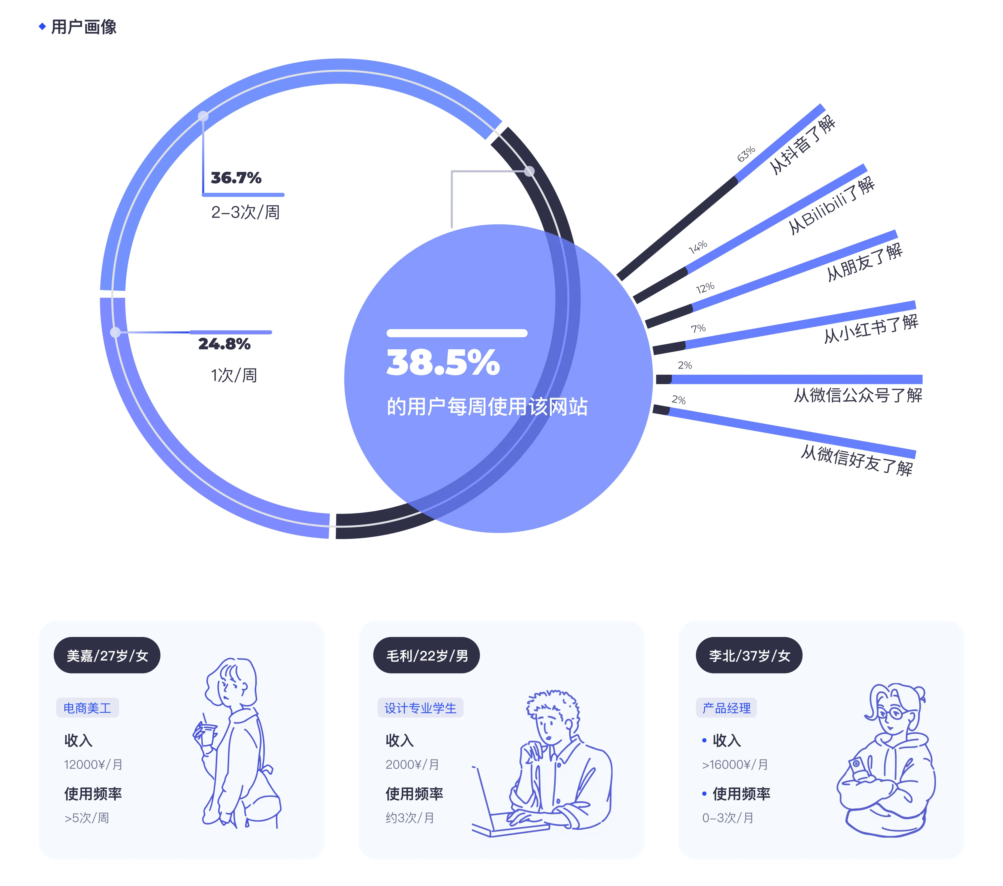 基于获取的网页搜索引擎数据与用户点击埋点数据,我们通过数据可视化技术对用户行为进行了深度分析,精准定位了用户需求与使用痛点。同时,我们与三位核心用户开展深度访谈,结合量化数据,构建了完整的用户画像体系。